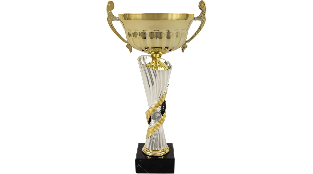 3/4 Gold Cup mit zwei Griffen. Fuß Trophäe in Silber und Goldtönen. Es basiert auf quadratischen Holzbasis basiert. Verfügbarkeit verschiedener Maßnahmen.