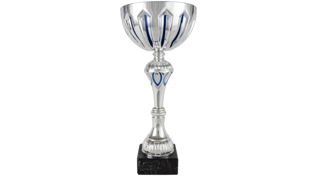 Cup Silber Ballon-Typ mit dünnen blauen Streifen -descendente sowieso auf. Lehnen am Fuß langen Hals geschnitzt. Die Trophäe ruht auf quadratischen Sockel aus Marmor. Verschiedene Maßnahmen.