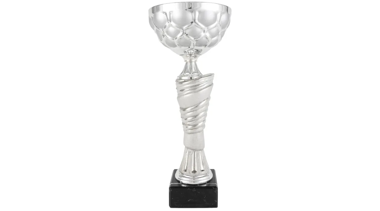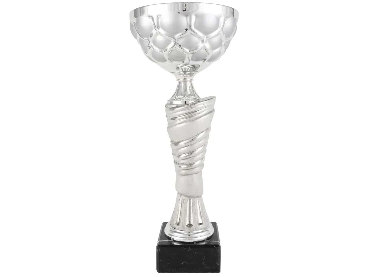 Silberbecher Art Blume in ihrem Glas. Lehnte sich gegen einen Fuß mit Plattenhalter an der Spitze. Unten geschnitzt und gekrönt mit einem Granatring Ton. Die Trophäe basiert auf quadratischen Terrakotta-braun-Basis. Verschiedene Maßnahmen.