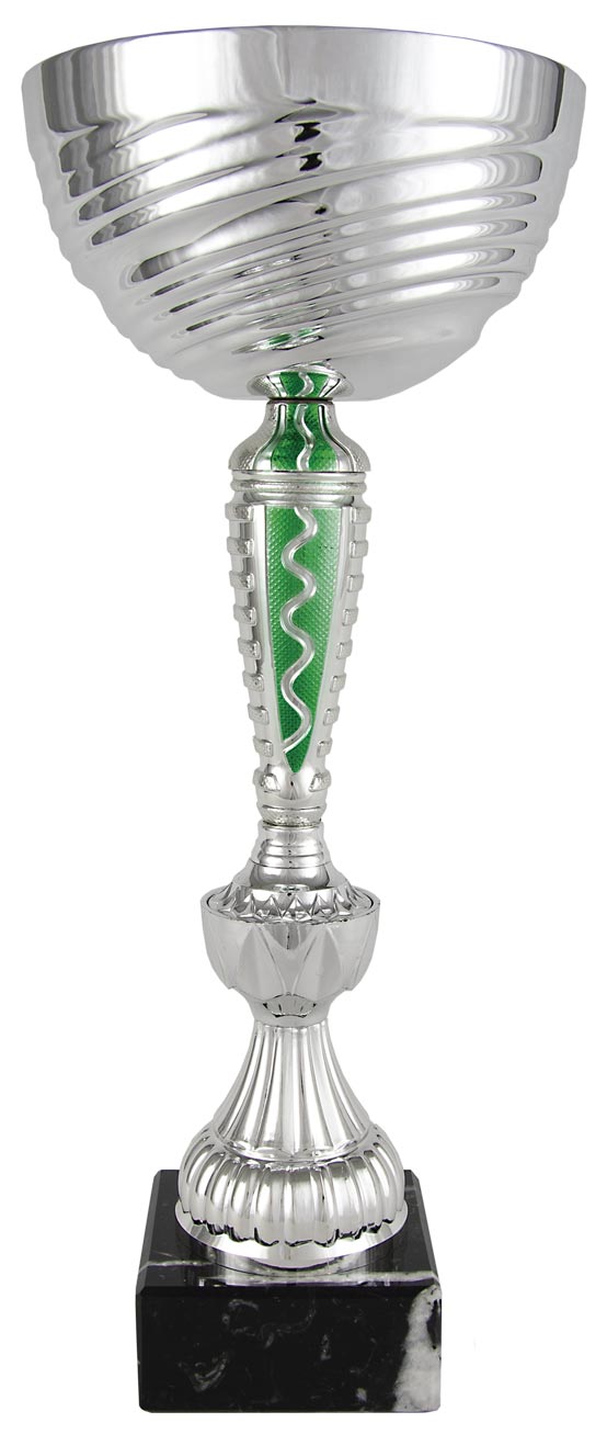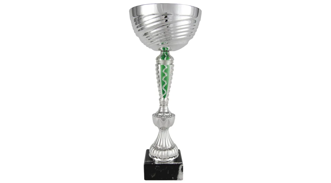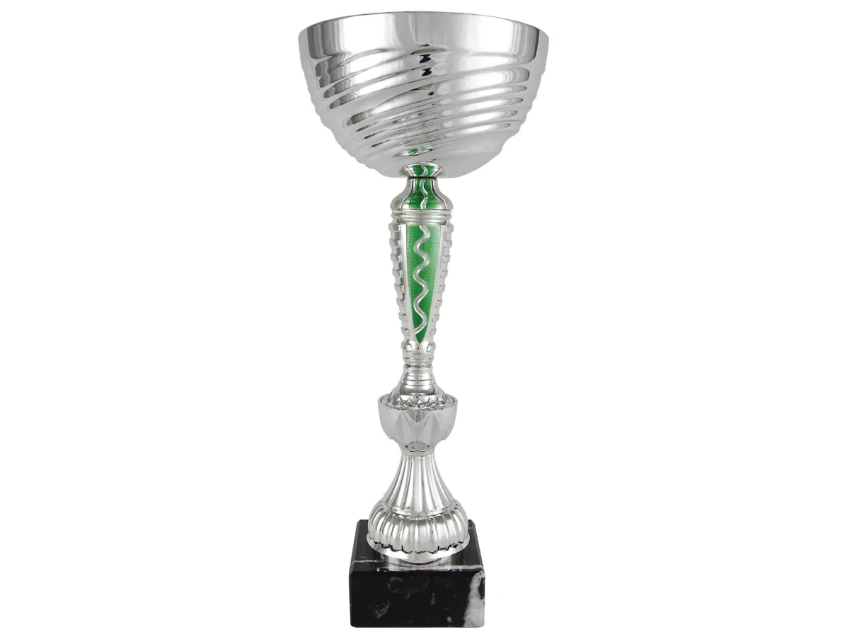 Silberner Kugelglasbecher mit grünem wellenförmigem Detail. Unterstützt durch einen langen, verzierten Halsfuß. Die Trophäe ruht auf einem quadratischen Marmorsockel. 5 verschiedene Maße.