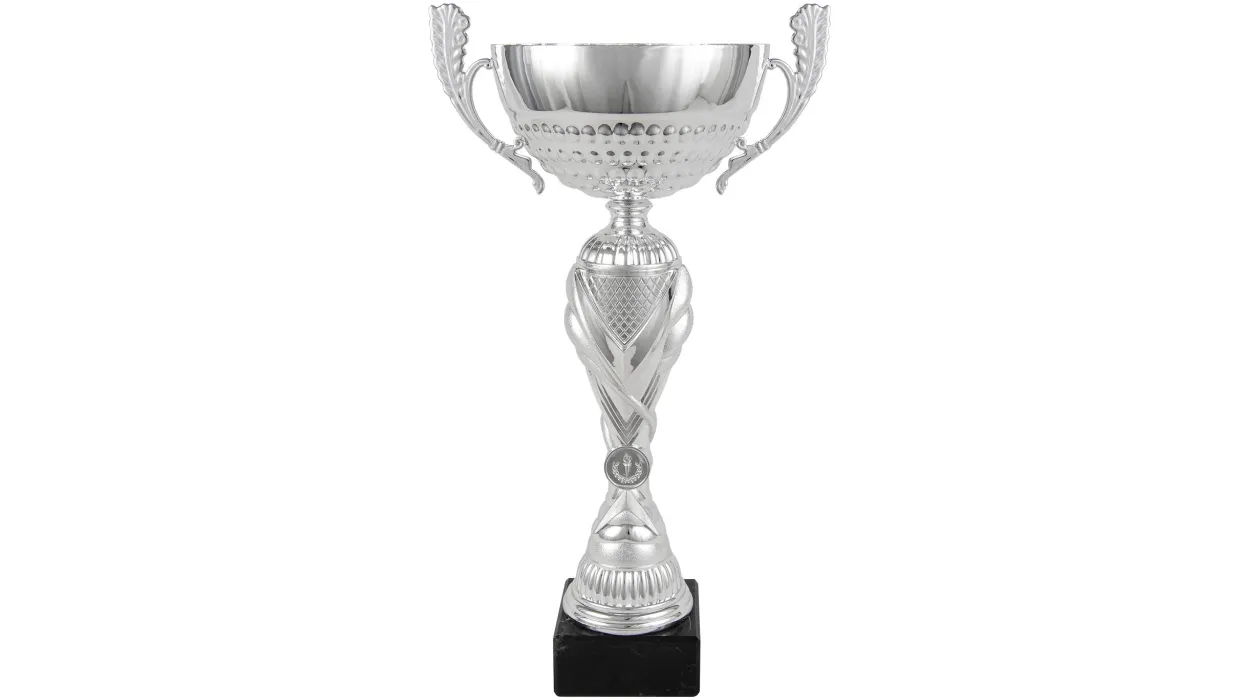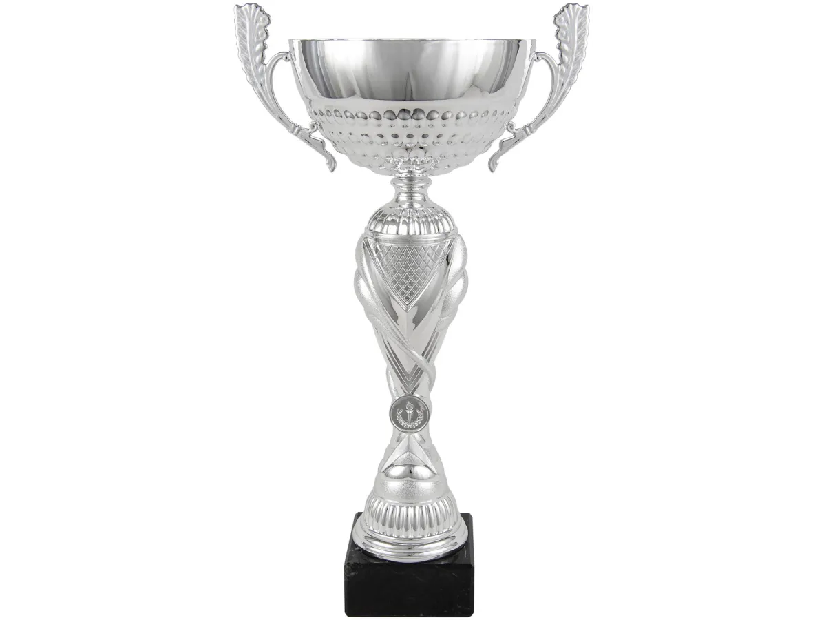 Niedrige Art Cup mit zwei dünnen horizontalen Streifen verziert. Es besteht aus zwei Griffe mit doppelter Krümmung und Spirale. Pie geschnitzt mit verschiedenen Motiven. Ruht auf quadratischen Holzbasis. Verschiedene Maßnahmen.