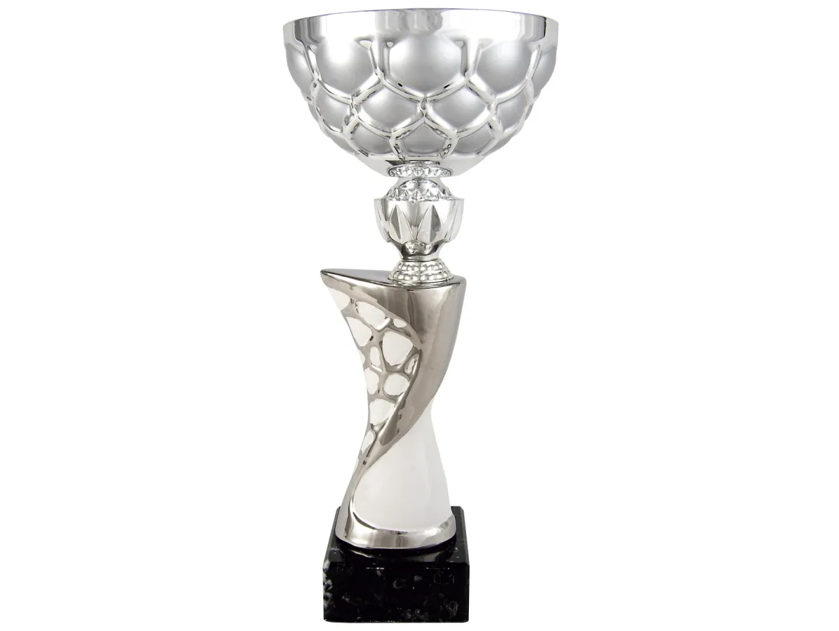 Elegantes Metallbecher mit Feinsilber spiralförmigen Griffen. Der Fuß ist Turtleneck Spirale. Die gesamte Baugruppe unterstützt wird, ist eine quadratische Grundfläche von grauem Marmor.