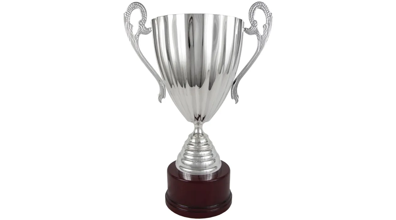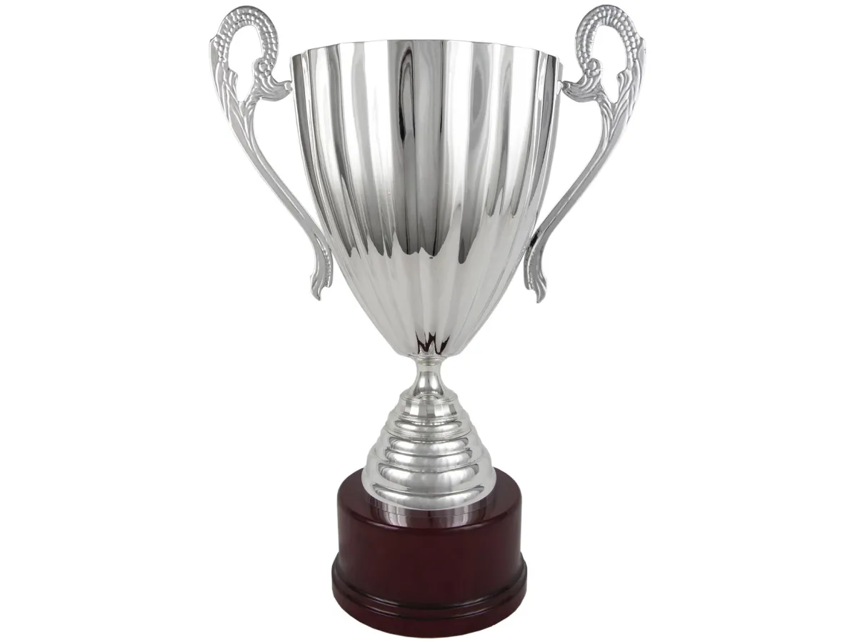 Feinsilber Pokalefarbe während eines ganzen arbeitete mit gekreuzten Linien. Silber Griffe geformt Chamäleon. Pie Inverted Cup, letzte Detail des Stockes Typ-Basis. Die Trophäe basiert auf einem Doppel quadratischen Holzsockel. In verschiedenen Größen erhältlich.