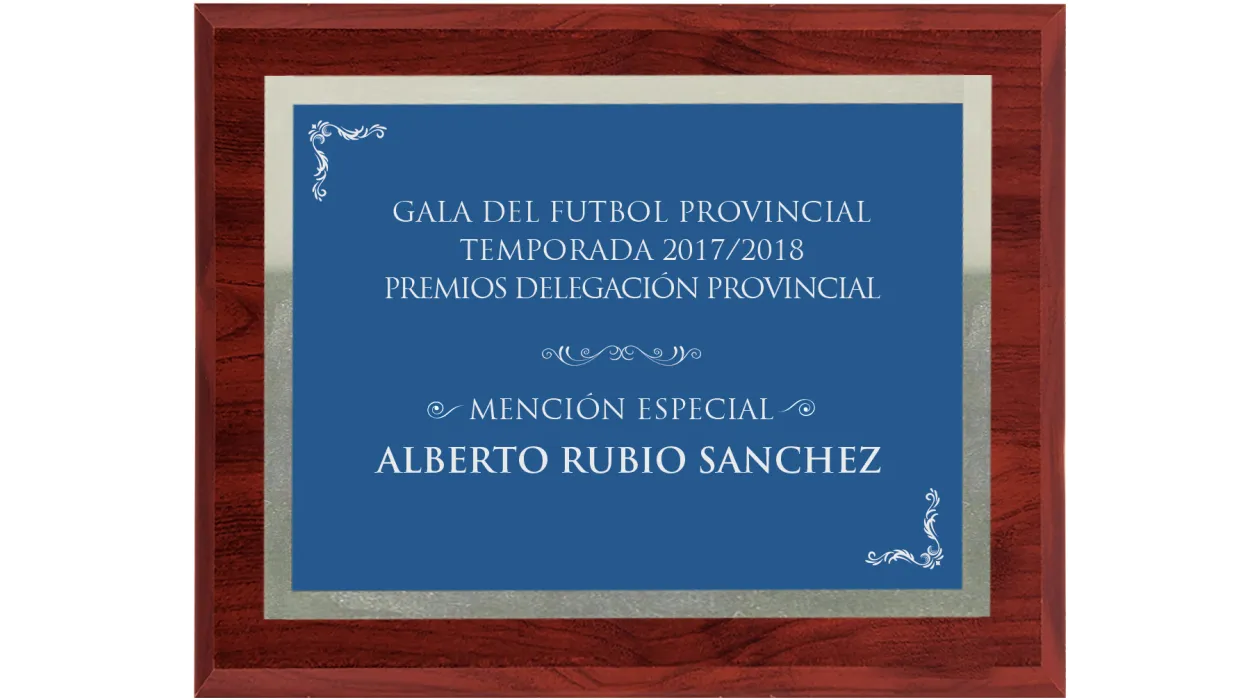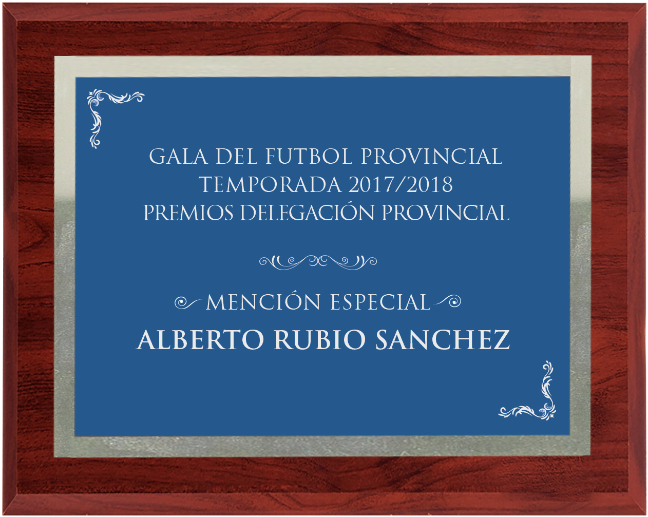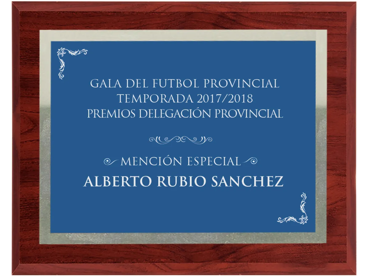 Tribute-Plakette mit Holzträger, die Plakette in Blau und eine weitere Plakette auf der Rückseite in Silber. In zwei Größen erhältlich. Ideal für Ehrungen, Jubiläen, Pensionierungen, Anerkennungen, Veranstaltungen und Geschenke.