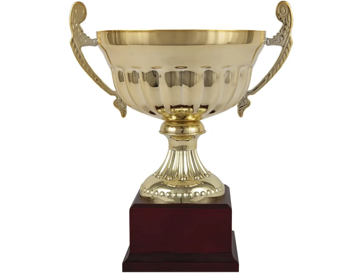 Gold Cup Eliterunde Glas mit kleinen Säulen verziert. Silber und Basis. Trophy Fuß in Gold geschnitzt. Schiefe gegen grauen Marmor. Verschiedene Maßnahmen.
