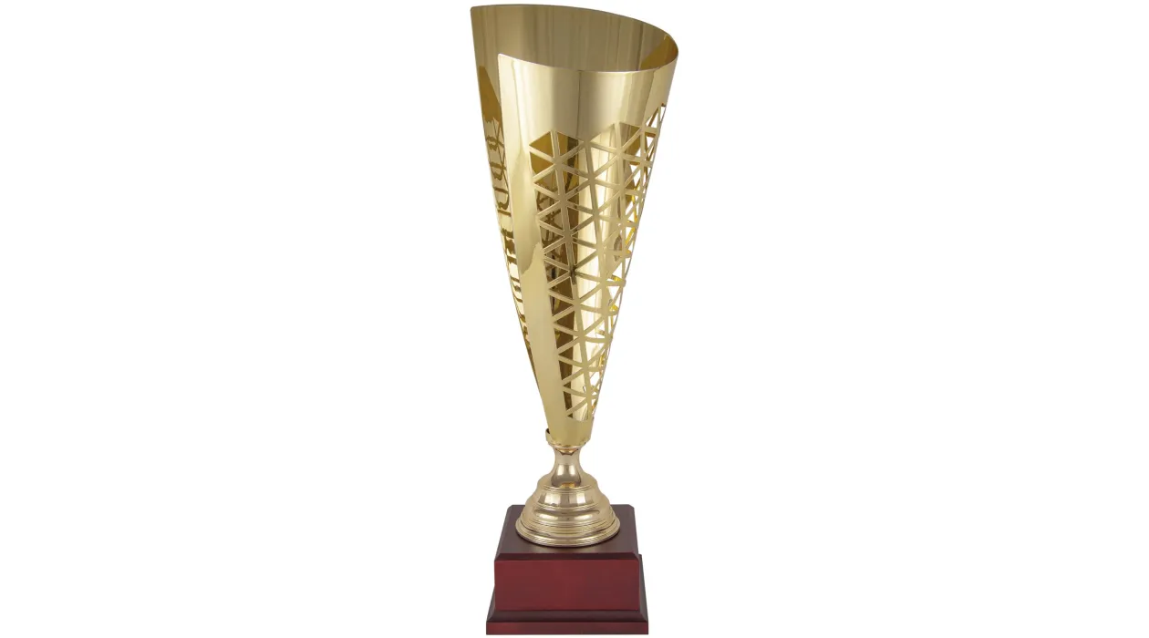 Typ Cup geometrischen Schnitt in Gold/Silber-Töne. Am Fuß des Bechers Detail Goldfarbe. Die Trophäe basiert auf quadratischen Holzbasis. Verfügbarkeit verschiedener Maßnahmen.
