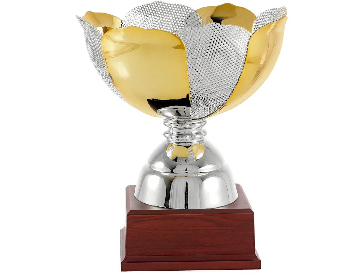 Copa Salatschüssel Blumenart. auf halbem Weg kugelförmiges Blume, Bicolor Gold/Silber. Stehend in Silber. Ruhen auf einem Holzsockel. In verschiedenen Größen erhältlich.