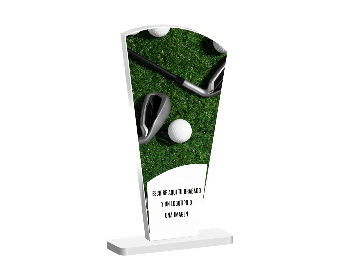 Golftrophäe aus weißem Methacrylat, um Ihr eigenes Bild auf der Rückseite hinzuzufügen. Das Methacrylat ist opak weiß und 5 mm dick. Die Basis besteht aus 6 mm dickem schneeweißem Methacrylat. Das Design beinhaltet das Golfbild, Sie fügen den Text im weißen Teil hinzu.