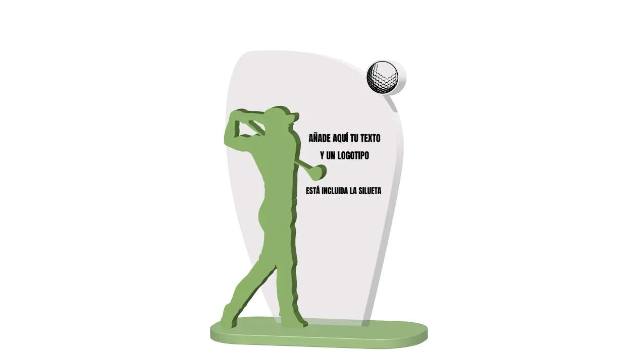 Trophäe aus Methacrylat in den Farben transparent und mattgrün. 8mm bzw. 6mm. Golf-Silhouette inklusive. Sie können die gewünschte Gravur mit einem Text und Logo oder einem Foto hinzufügen.