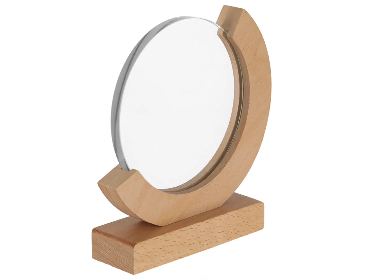 Runde Trophäe aus Holz und Glas. Die Gravur befindet sich auf dem Glas und hat einen maximalen Durchmesser von 100 x 100 mm. Sockel und Rand der Trophäe sind aus naturbelassenem Holz gefertigt und lackiert. Die Trophäe wird in einer Präsentationsbox geliefert (siehe Fotos).