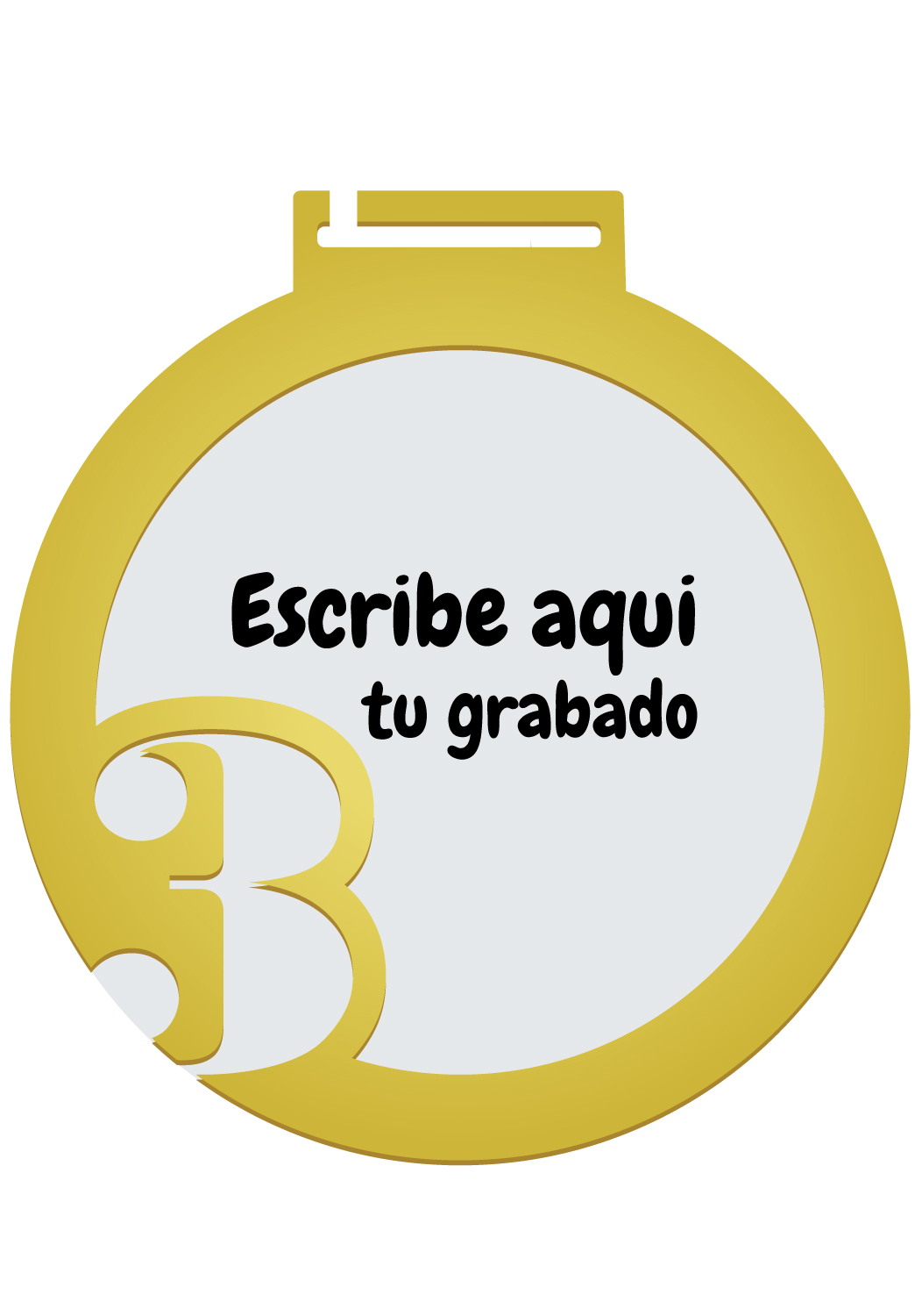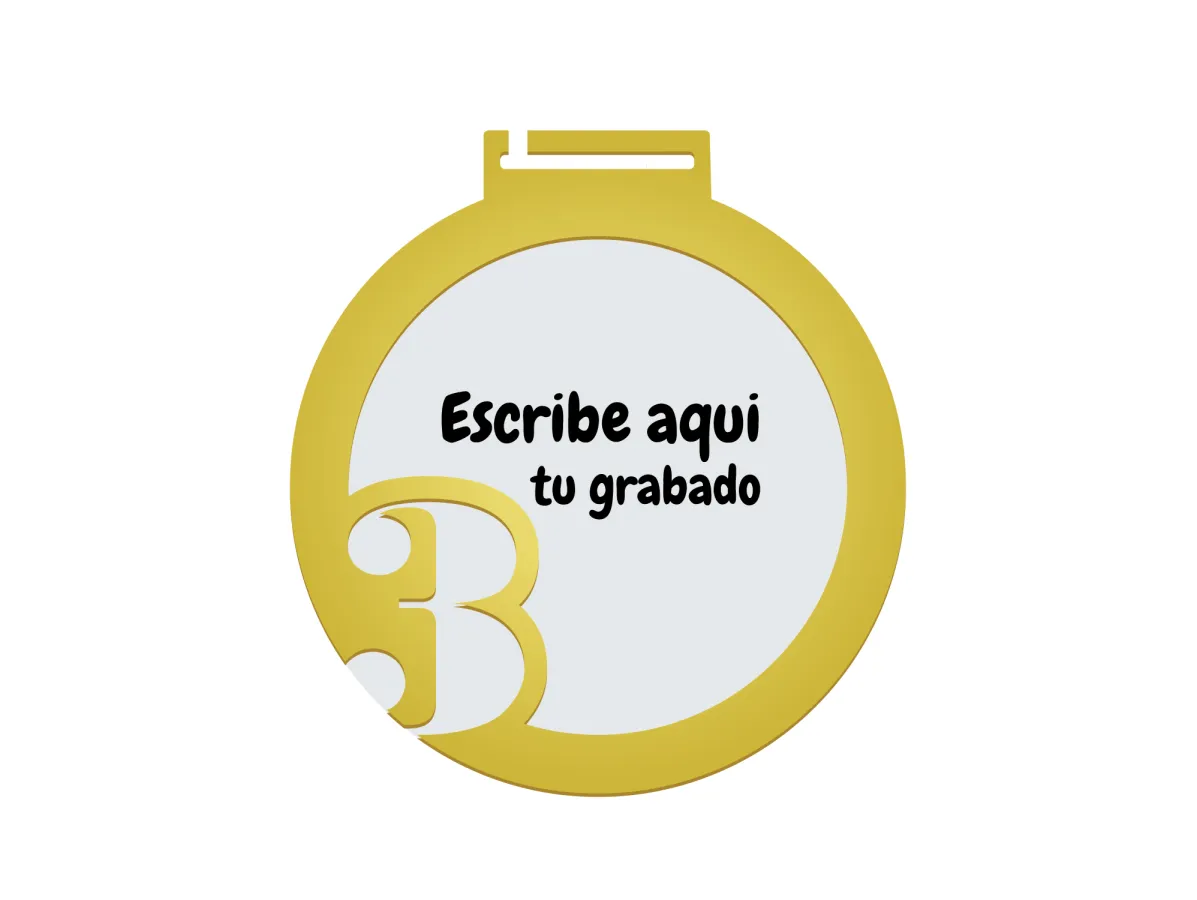 Methacrylat-Medaille, bestehend aus 2 Teilen, einem 3 mm dicken transparenten Methacrylat-Teil und einem weiteren spiegelgoldenen Teil auf der Vorderseite mit der Nummer 3 und einem Ring. Maße: 7 cm hoch und 6,5 cm breit.