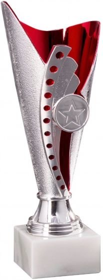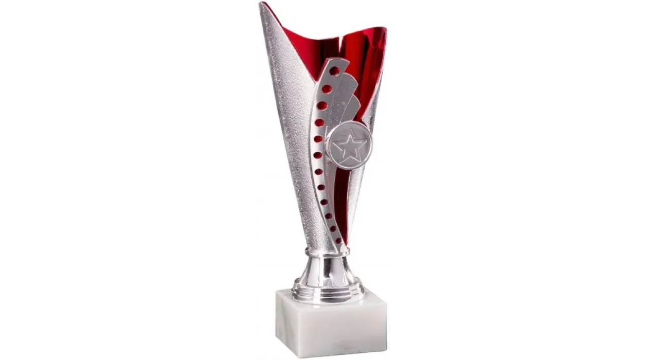 Eleganter Pokal im Pergament-Stil und geschliffenes Glas. Die Trophäe ist innen rot und hat eine Scheibe mit 25 mm Durchmesser. Die Scheibe ist in verschiedenen Sportscheiben-Modellen erhältlich. Der Sockel ist niedrig. Das Set ruht auf einem quadratischen Marmorsockel.