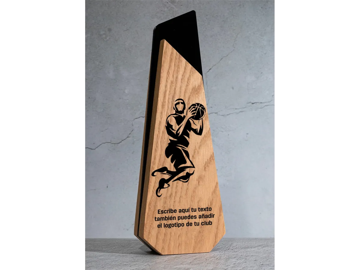 Feiern Sie sportliche Erfolge auf dem Basketballfeld mit dieser personalisierten Trophäe aus Holz und Acryl, die speziell für Basketballturniere, Meisterschaften und Events entworfen wurde. Ihr modernes, geometrisches Design vereint die warme Haptik von Naturholz mit der Eleganz von schwarzem Acryl und schafft so eine anspruchsvolle, langlebige und optisch beeindruckende Auszeichnung.