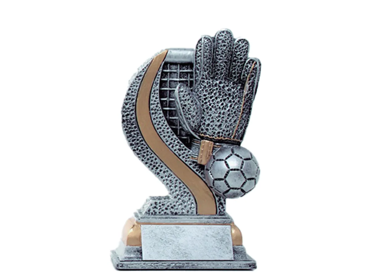 Fußballtrophäe mit der Darstellung eines Handschuhs und eines Balls, ideal zur Auszeichnung des besten Torwarts in einem Turnier oder Wettbewerb. Diese Trophäe ist perfekt, um das Können und die Geschicklichkeit der Torhüter auf dem Spielfeld hervorzuheben.