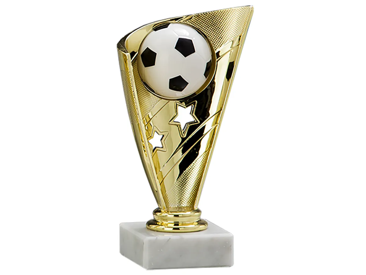 Goldener Fußballpokal mit Stern und Ball, ideal zur Auszeichnung der Siegermannschaft eines Turniers oder Wettbewerbs. Diese elegante Trophäe eignet sich perfekt, um sportliche Leistungen hervorzuheben und den Wettbewerb auf dem Spielfeld zu fördern. Es verleiht jeder Sportveranstaltung einen Hauch von Vornehmheit und Eleganz.