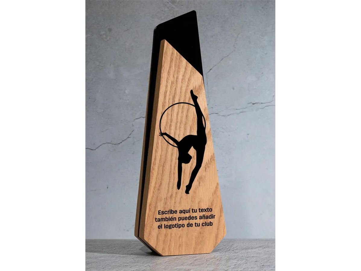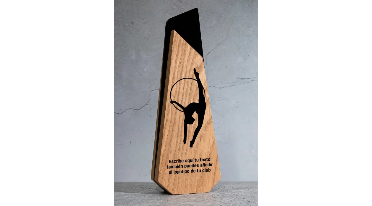 Die eingravierte Silhouette einer Turnerin mit Reifen ist ein einzigartiges visuelles Detail, das die Hingabe und Technik dieser Disziplin perfekt widerspiegelt. Dank der Holzoberfläche eignet sie sich für eine individuelle Lasergravur, auf der Sie den Namen der Veranstaltung, die Kategorie, die Platzierung, den Namen der Athletin/des Athleten sowie das Logo des Vereins oder der Institution anbringen können.