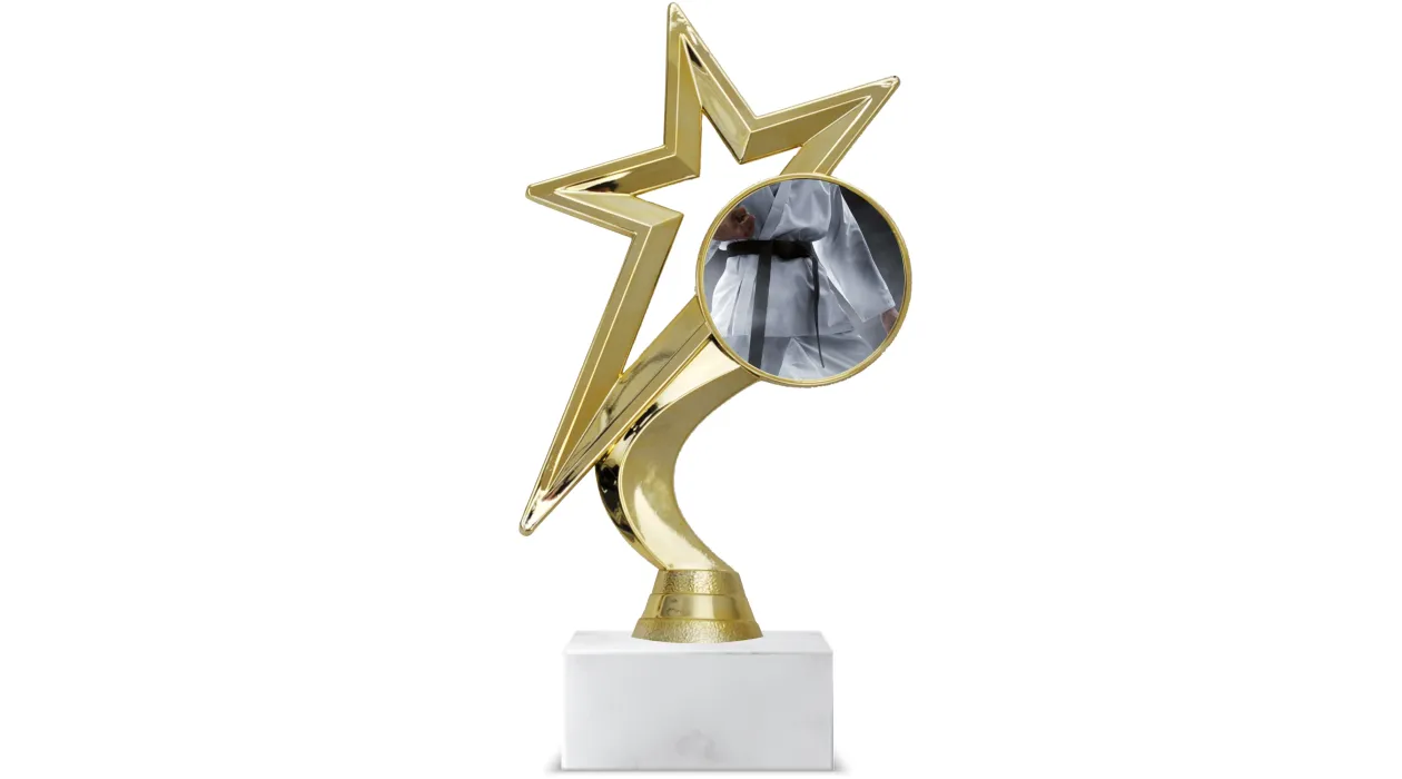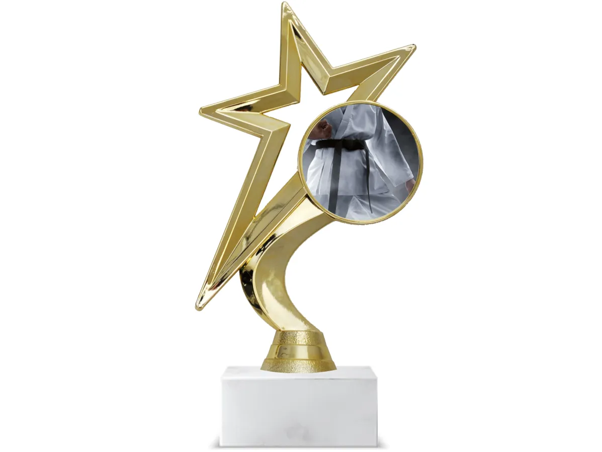 Diese Karate-Star-Trophäe ist perfekt, um den besten Spieler Ihres Teams zu belohnen. Mit einem einzigartigen Design, das ein Symbol zeigt, ideal, um Anstrengung und Hingabe auf dem Spielfeld zu belohnen. Geben Sie Ihrem Spieler mit dieser besonderen Trophäe das Gefühl, ein echter Star zu sein! Hergestellt aus ABS und Marmor.