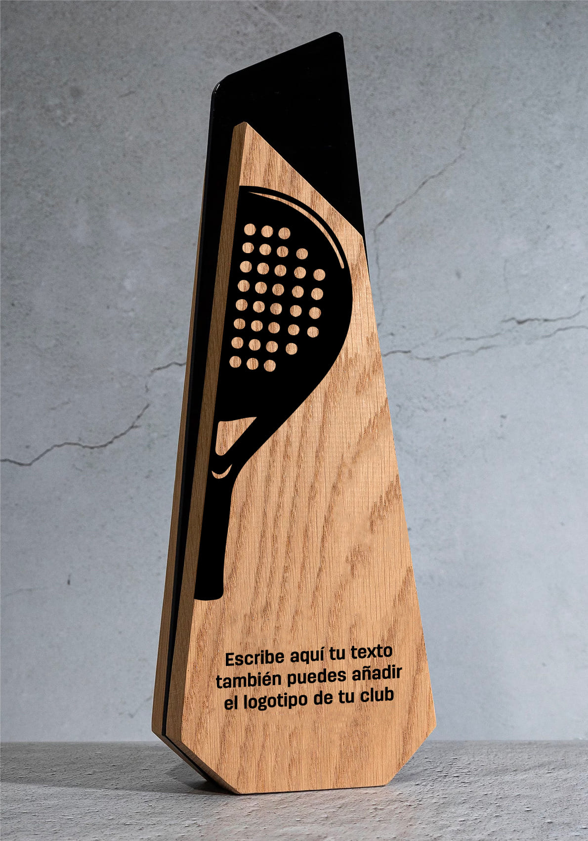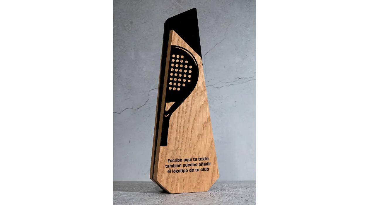Diese Padel-Trophäe aus Holz und Acryl vereint modernes Design, hochwertige Materialien und exklusive Individualisierungsmöglichkeiten und würdigt berufliche Leistungen, Führungsqualitäten und Exzellenz. Ihre stilisierte geometrische Struktur verbindet die natürliche Wärme des Holzes mit der Eleganz des glänzenden schwarzen Acryls und schafft so ein stilvolles, langlebiges und optisch beeindruckendes Sammlerstück.