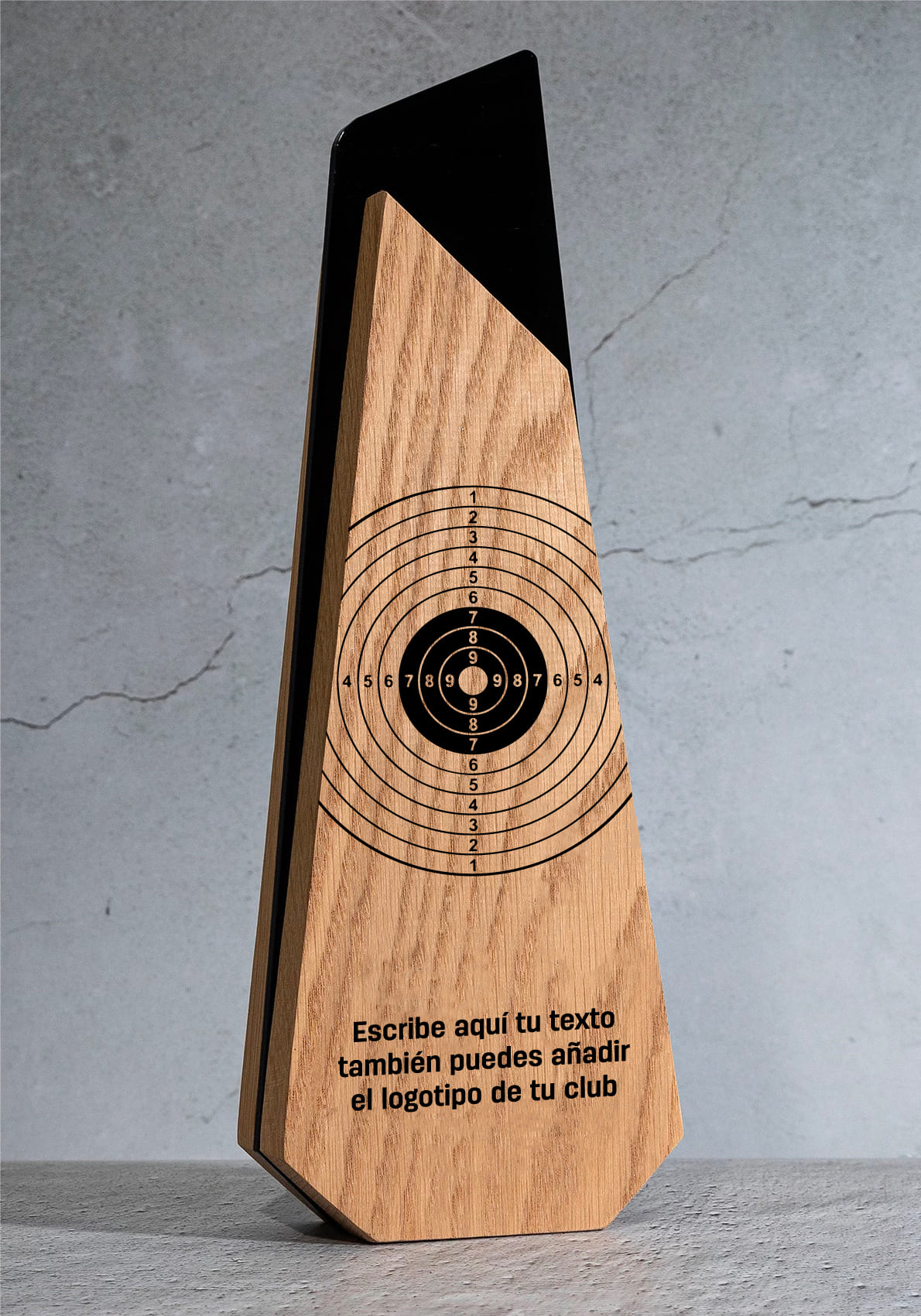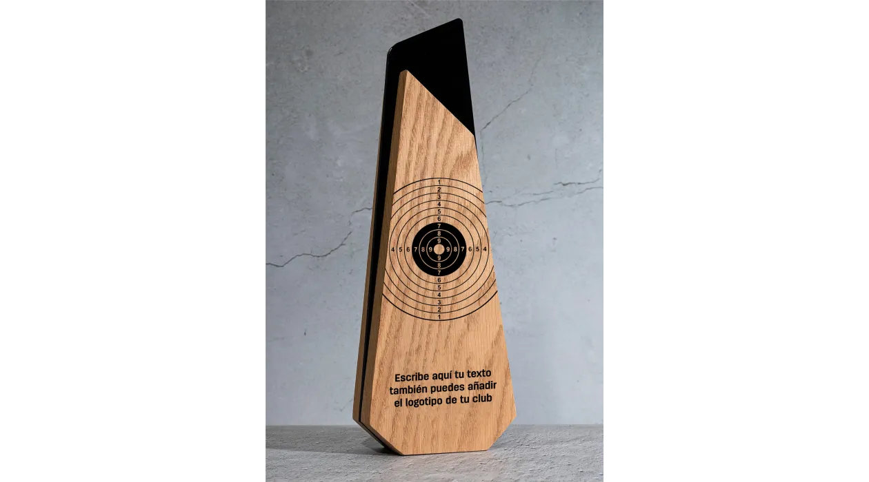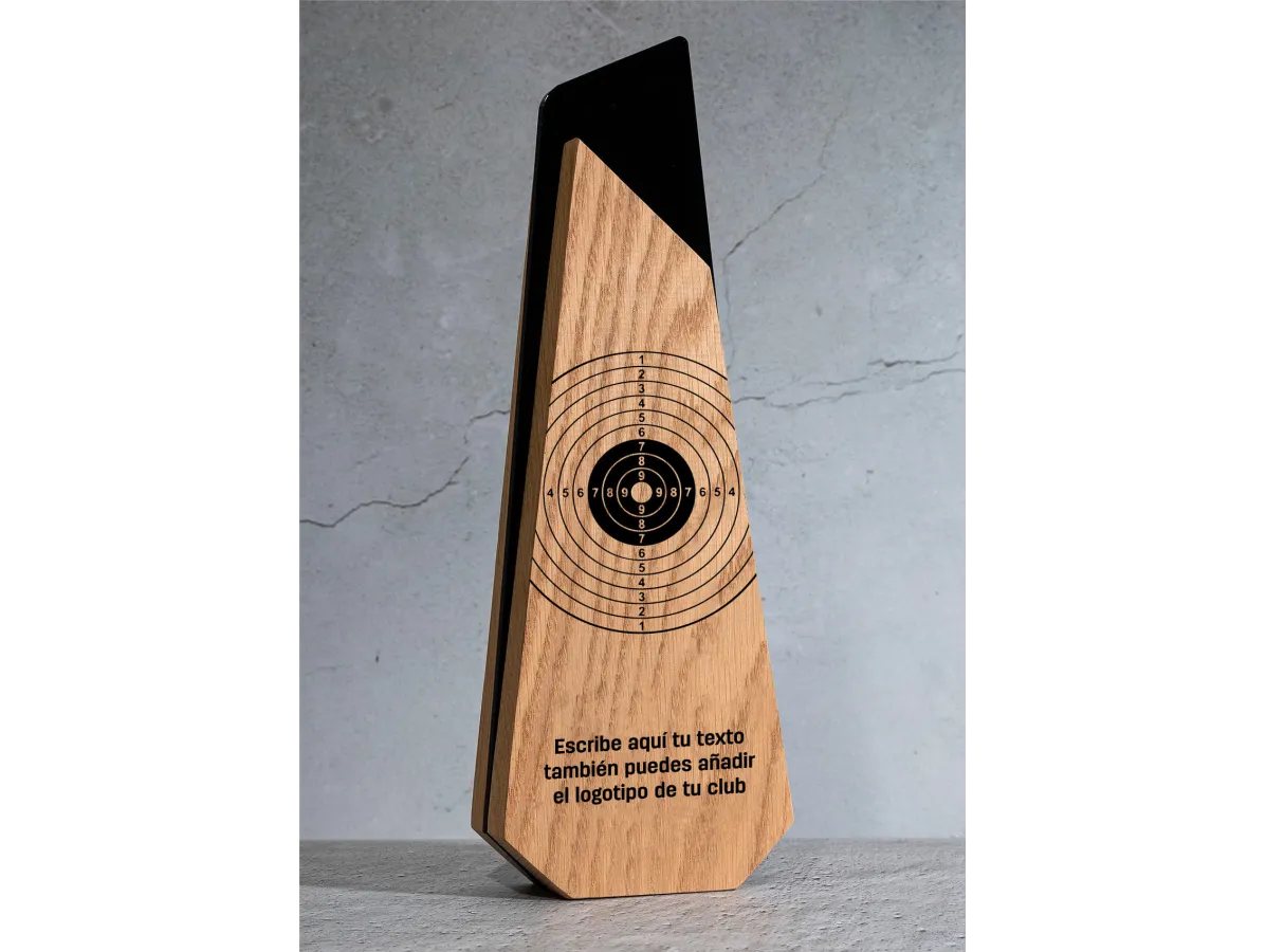 Diese aus Holz und Acryl gefertigte olympische Schießtrophäe vereint modernes Design, hochwertige Materialien und exklusive Individualisierungsmöglichkeiten und würdigt professionelle Leistungen, Führungsqualitäten und Exzellenz. Ihre stilisierte geometrische Struktur verbindet die natürliche Wärme des Holzes mit der Eleganz des glänzenden schwarzen Acryls und schafft so ein stilvolles, langlebiges und optisch beeindruckendes Objekt.