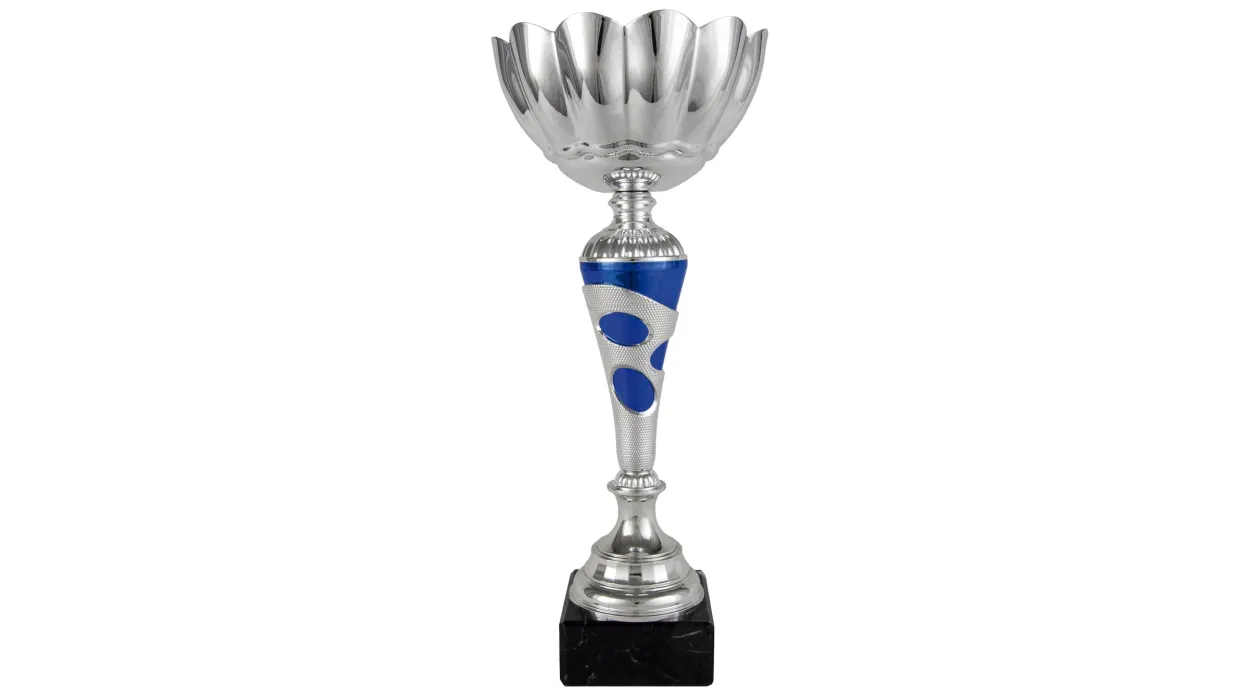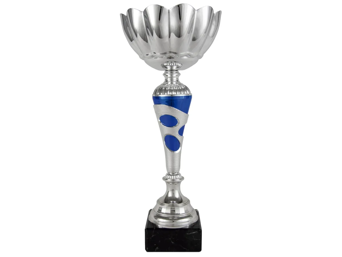 Cup Kugeltyp, Netz Detail blau eingekreist. Stützte sich die Füße mit einem Plattenhalter 25 mm im Durchmesser, zwischen verschiedenen Aktivitäten oder Sport, in seinem Mittelteil mit den blauen und tilled Töne zu wählen. Der Satz basiert auf quadratischen Sockel aus Marmor. Verschiedene Maßnahmen