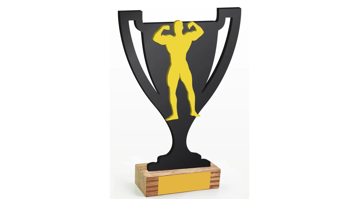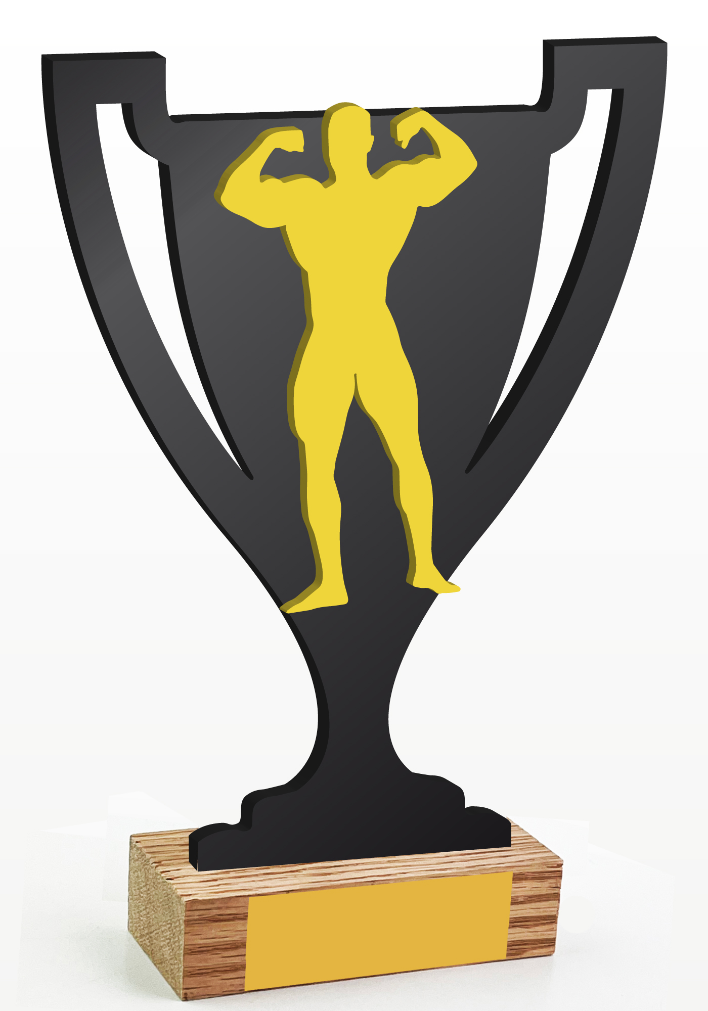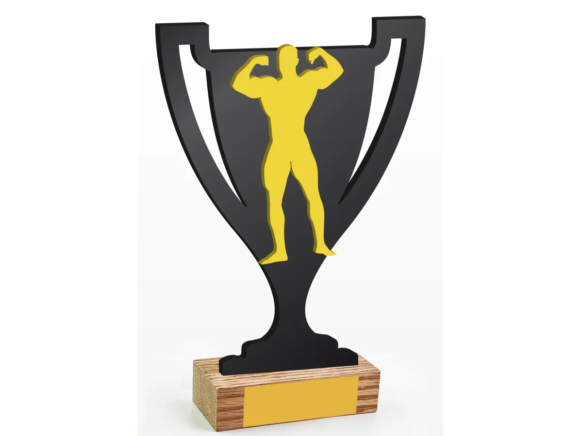 Trophäe aus schwarzem und goldenem Acryl. Er besteht aus zwei Silhouetten, der hinteren Silhouette in Form einer Tasse und der vorderen Silhouette in der Sportform der ausgewählten Sportart.Die Trophäe ist 8 mm breit und hat einen schwarzen Marmorsockel.