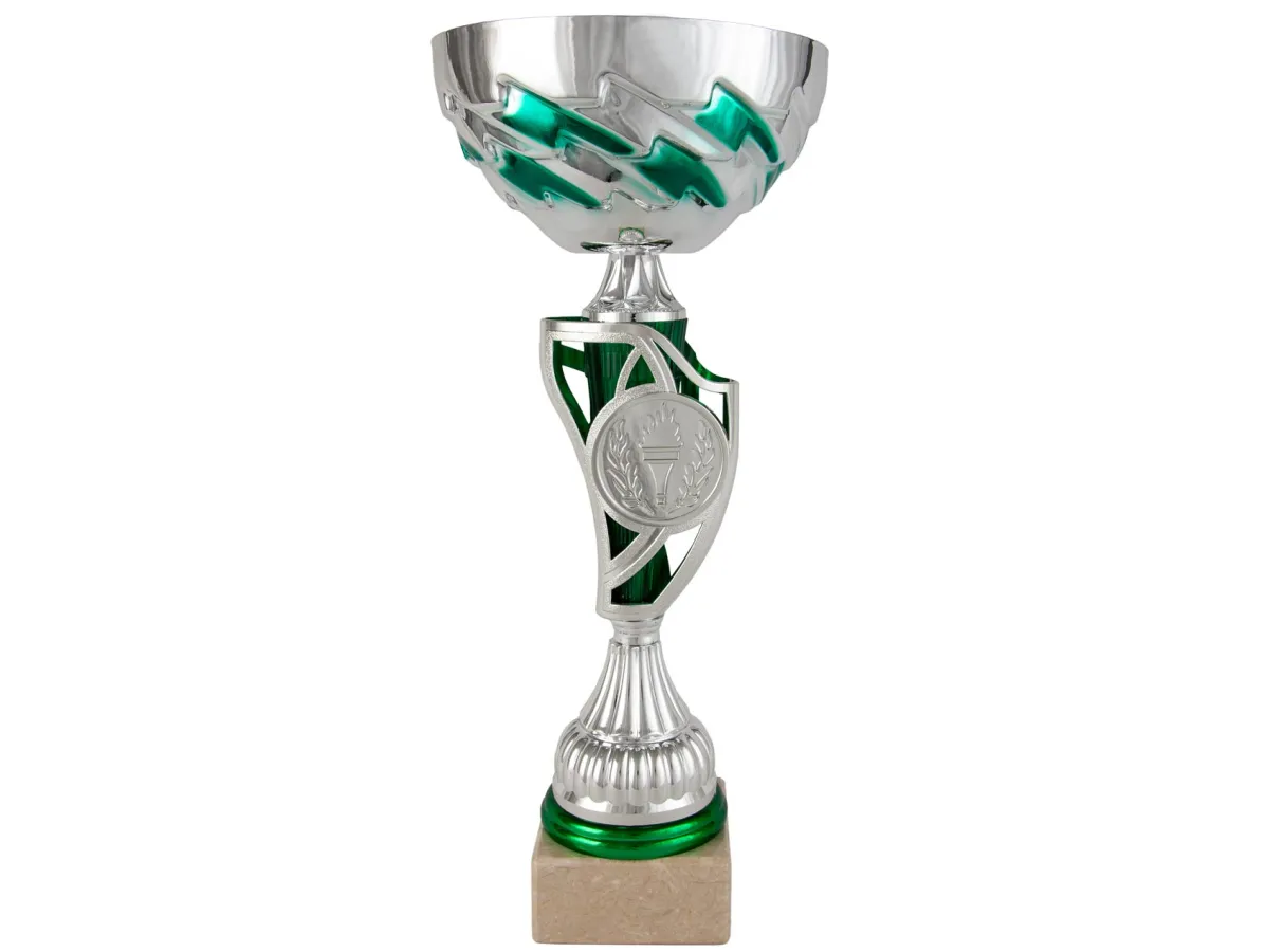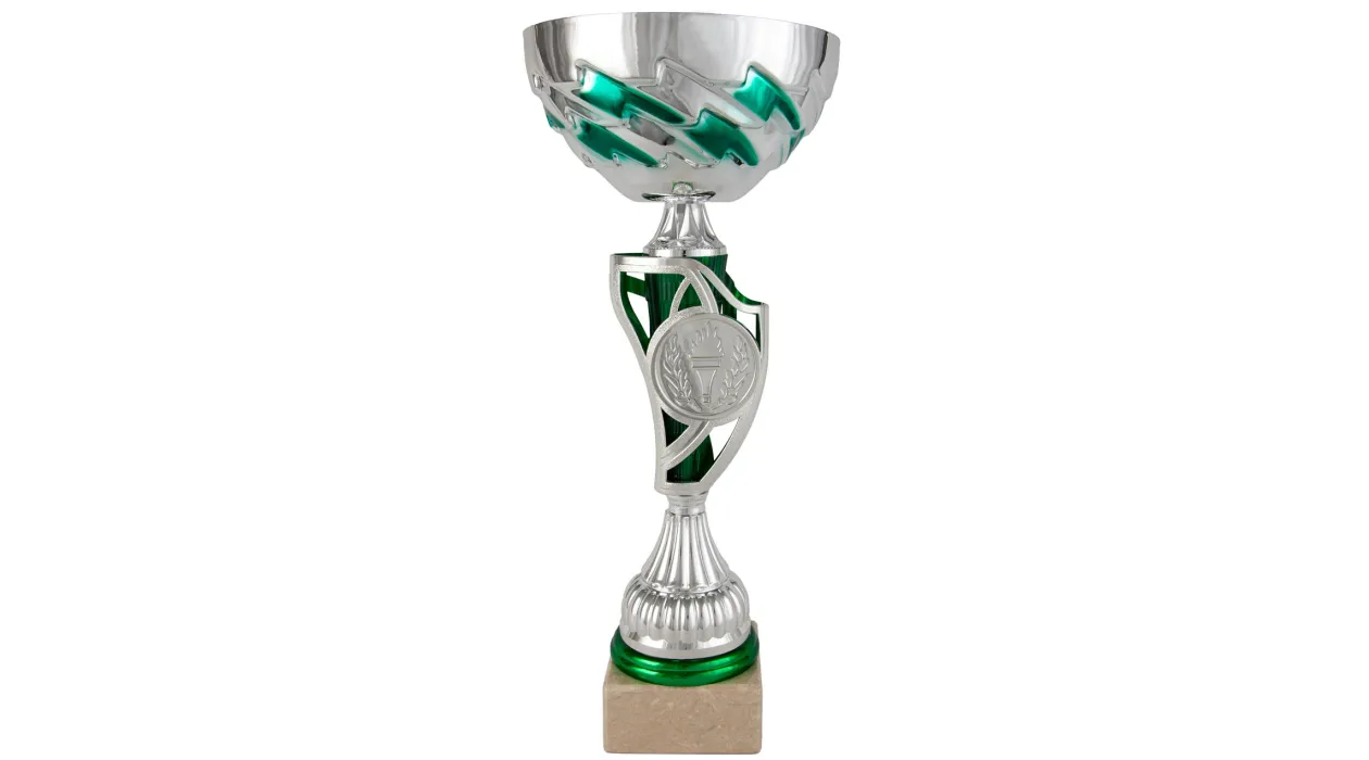 Silberbecher Kugel mit schnabelförmigen Band geschnitzt. Lehnte sich gegen einen Fuß Spitze Scheibe 25 mm, Option für verschiedene Sportarten, in smaragdgrünen Tönen. Ganze Fuß geschnitzt. Die Trophäe ruht auf Marmor quadratischen Sockel.