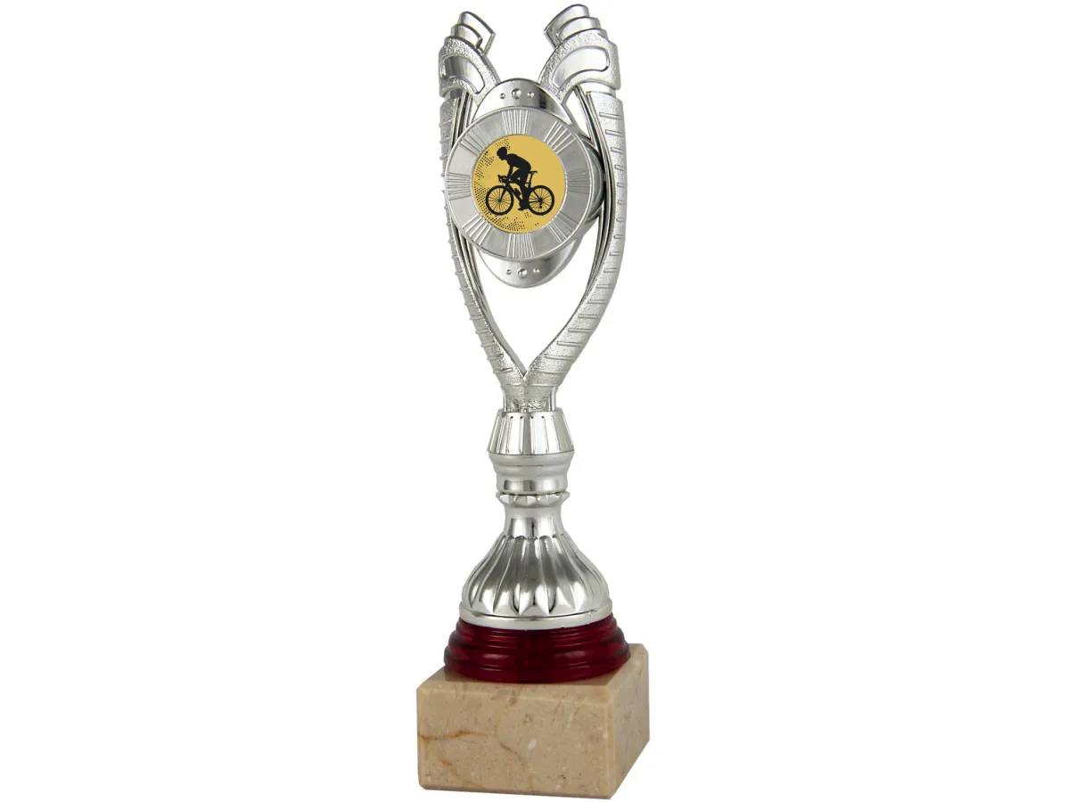 Trophy Runde Mini-Disc-Halter in der silbernen Farbe, hat eine Scheibe von 50 mm Durchmesser, mit einer Option zwischen den verschiedenen Modellen von Sport Aufzeichnungen zu wählen. Ruht auf Platz Marmorsockel